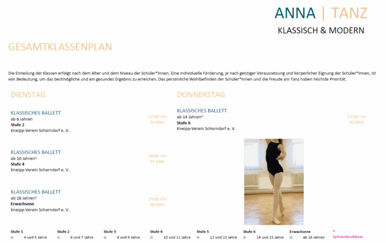 Anmel­de­un­ter­la­gen, Gebüh­ren und Kon­di­tio­nen, Info­ma­te­ria­li­en sowie Klas­sen­plä­ne zum Ange­bot von ANNA | TANZ und den Koope­ra­ti­ons­part­nern.
